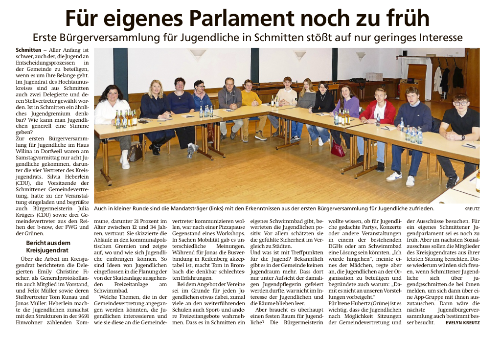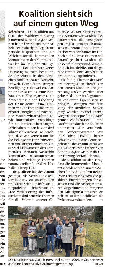 Die Schmittener Koalition aus CDU, b-now und Grünen stellt auf ihrer diesjährigen Klausur die Weichen für die zweite Hälfte der laufenden Legislaturperiode. „Wir wollen uns weiter um die größeren und grundsätzlichen Themen unserer Gemeinde kümmern“, formuliert hierbei Denis Knappich von der CDU die Zielsetzung. Konkret sind das die generelle Haushaltssituation und das Thema Kinderbetreuung. „Wir sind froh, dass wir bei den Haushaltsberatungen endlich in einem vernünftigen Zeitrahmen agieren können“, ergänzt Irene Hubertz von den Grünen. Zur Erinnerung: da die Haushalte der Vorjahre nicht abgeschlossen waren, konnte im Haushaltsjahr der jeweils aktuelle Plan nicht verabschiedet werden. Dies wird dieses Jahr seit langem wieder möglich sein und so Teil von konkretem, parlamentarischem Handeln. Die Koalition begrüßt hier klar den gefundenen Konsens auch mit den Oppositionsfraktionen. Der Haushalt wurde ja wie bekannt einstimmig verabschiedet. „Mit einem von allen Parlamentariern mitgetragenen und einer konkreten Vorgehensweise wird das Parlament nun die Verwaltung mit konstruktiven Impulsen für Einnahmen und Ausgaben unterstützen“, ergänzt Annett Fomin-Fischer von der b-now und verdeutlicht damit einen der Schwerpunkte der Koalition.
