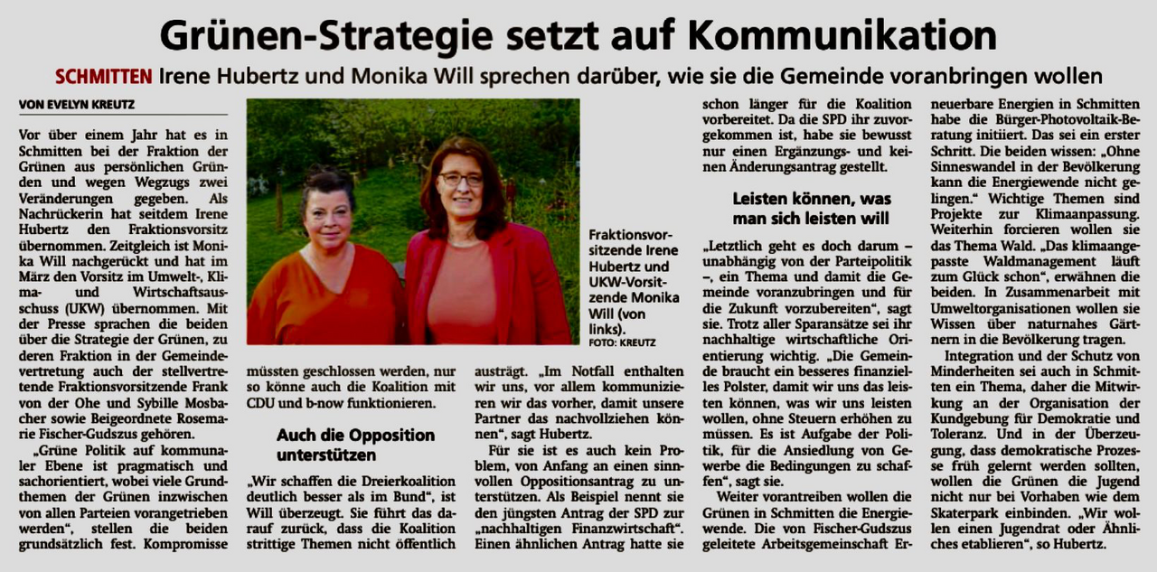 Schmitten. „Das Thema Waldbewirtschaftung wieder in die Beratung durch die Gemeindevertretung zu bringen, zeigt Früchte“, freut sich Annett Fomin-Fischer, Fraktionsvorsitzende der b-now über das Ergebnis des vergangenen UKW-Ausschuss (Umwelt-, Klima- und Wirtschaftsausschuss). Zur Erinnerung: jahrelang wurde das Thema ausschließlich im Gemeindevorstand und damit ohne Einflussnahme durch die Gemeindevertretung behandelt.